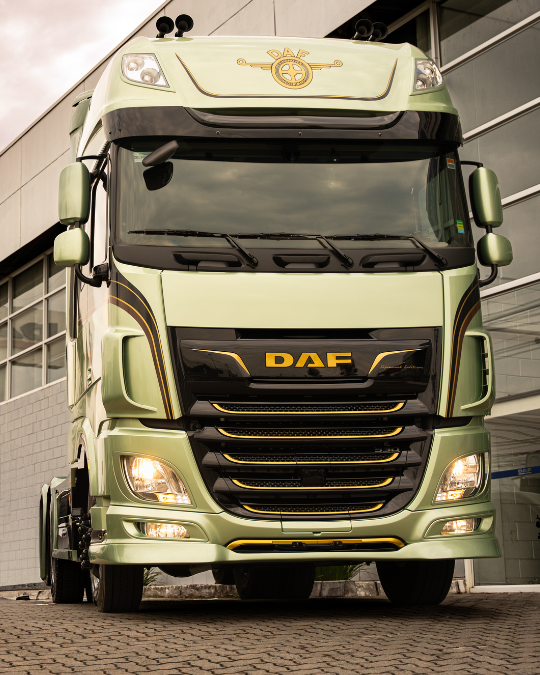 Apresentada na última edição da FENATRAN, a Série Especial da DAF foi desenvolvida para homenagear a história da marca com um design marcante e refinado. O modelo se destaca pela pintura personalizada em verde clássico, detalhes dourados e acabamento exclusivo que ressalta a robustez e a elegância do veículo.